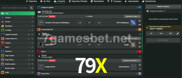 O 79X oferece uma grande seleção de opções de apostas em e-sports com probabilidades competitivas
